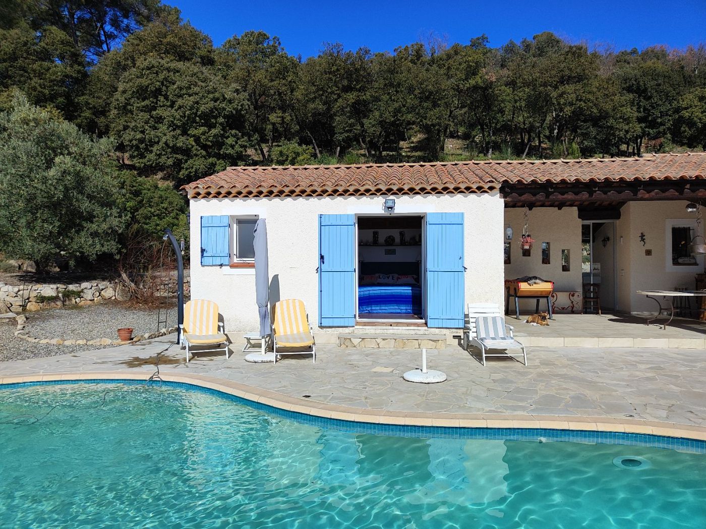 La "Chambre du Marin" est independante du reste de la maison, avec sa propre entrée, donant sur la piscine. 100€ la nuit.