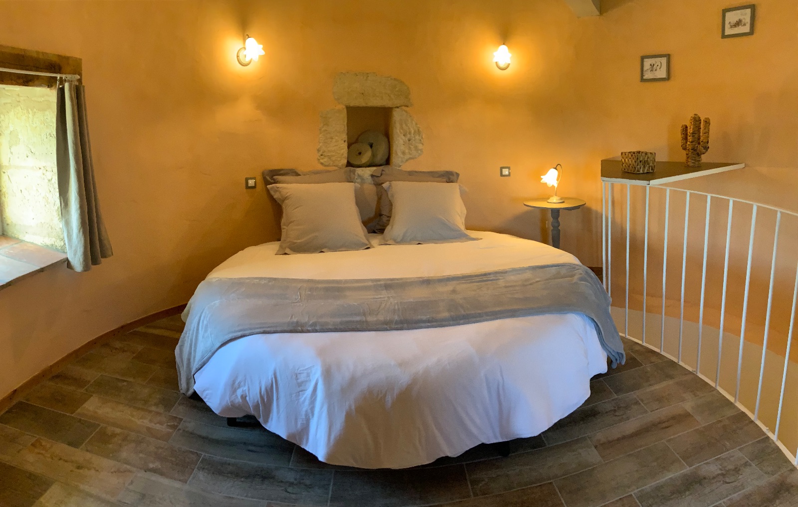 Le moulin de la jalousie : l'espace intérieur a été parfaitement optimisé pour pouvoir proposer sur trois niveaux une chambre avec sont lit rond,une salle d'eau et WC indépendant, une cuisine très bien équipée.