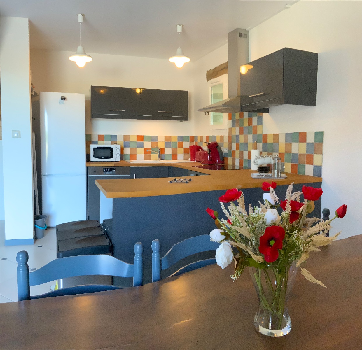 La maison du bonheur : elle est équipée au rez-de-chaussée d'une cuisine ouverte sur un bel espace repas, ainsi que sur le salon avec un canapé convertible de qualité. à l'étage, deux chambres avec chacune un lit Queen size et salle d'eau privative avec WC. À l'extérieur, une grande terrasse, couverte très lumineuse avec son petit coin, cuisine d'été équipée d'une plancha vous attend pour partager de bons repas en toute tranquillité en famille ou entre amis.