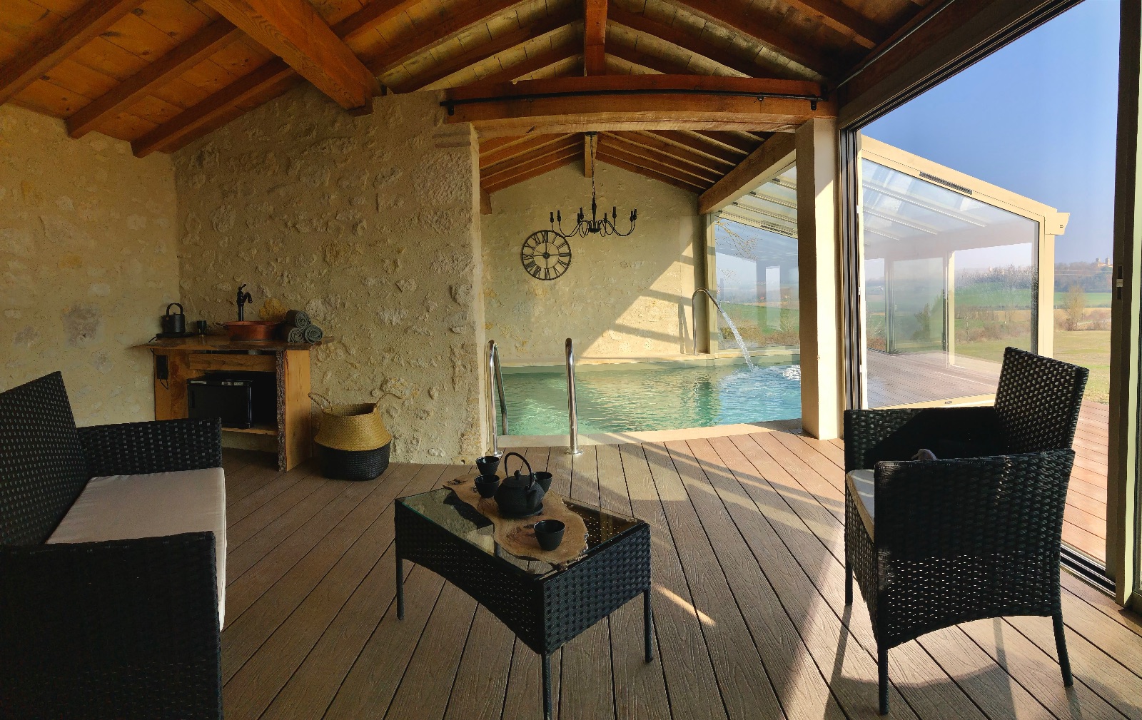 L’espace s'ouvre sur la campagne gersoise avec une vue sur la chaine des Pyrénées, le village de Terraube et son château, et selon la saison, peut préserver sa douce chaleur dans un espace cocooning tout en conservant cette impression dedans/dehors.
