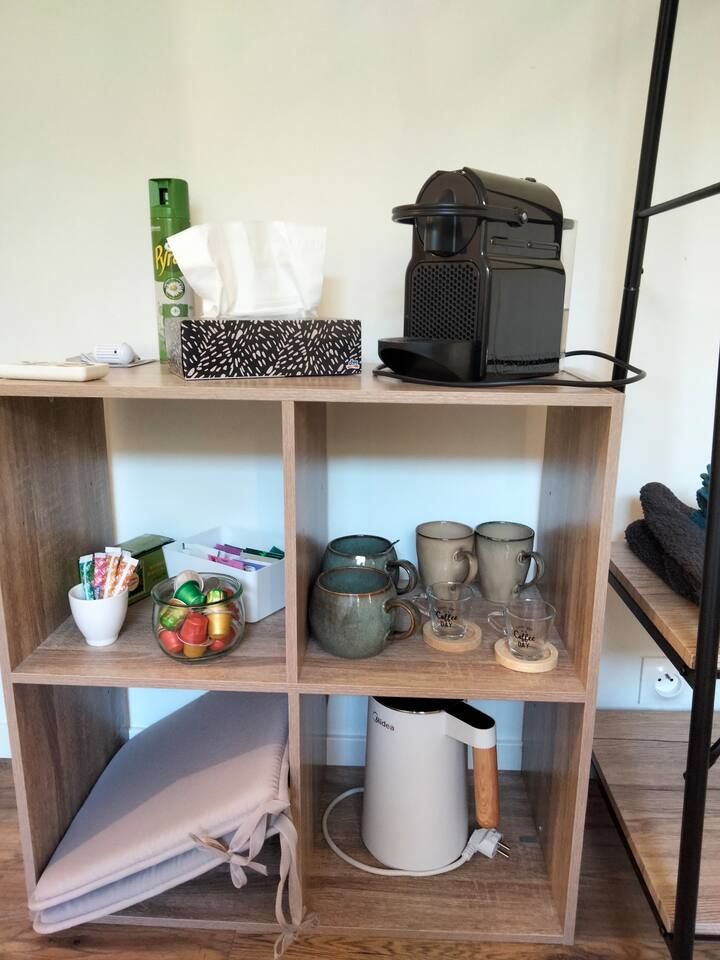Une machine à café nespresso avec des capsules et une bouilloire avec des sachets de thé et tisane, du sucre et des tasses.