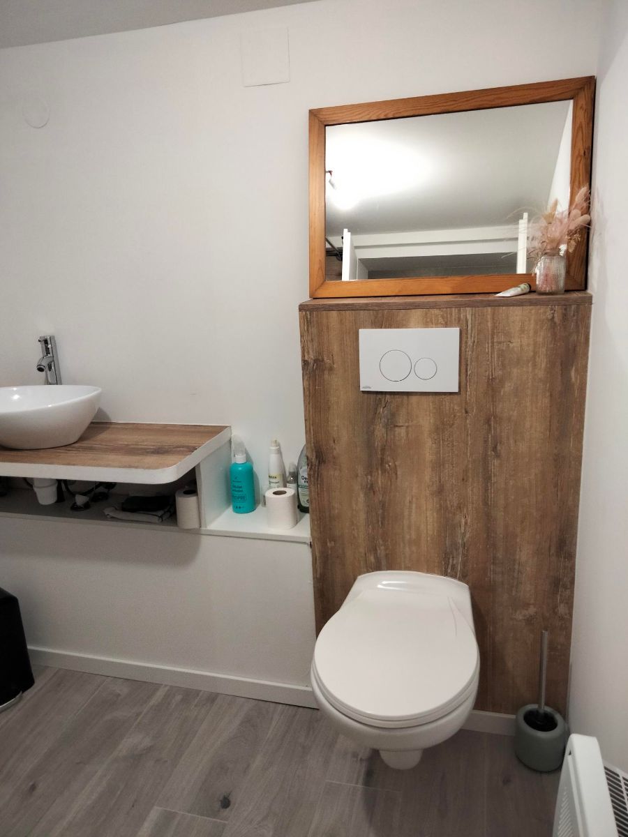 En toute simplicité, il y a juste ce qu'il faut : un canapé lit, une salle de bain avec lavabo, WC et douche.
