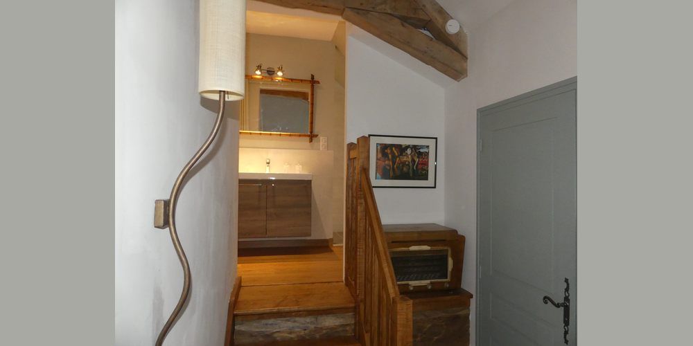 A l'étage : Sur le palier, un petit escalier mène à la salle d'eau ouverte, équipée d'un lavabo, d'une douche à l'italienne et d'un WC séparé, la chambre, tons taupe et blanc, belle hauteur sous plafond, lit king size, armoire de rangement, la fenêtre orientée plein sud donne sur le parc et le chemin forestier.