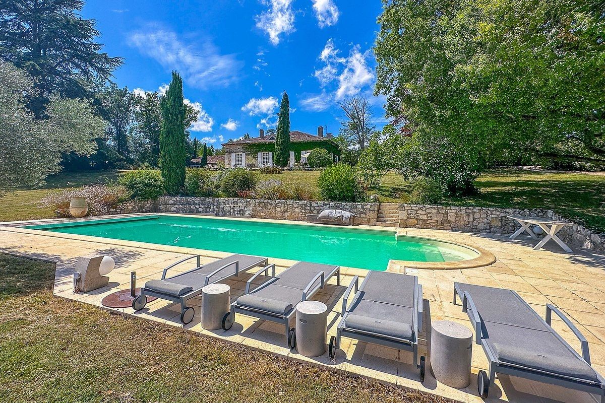 La piscine de 12 x 6 mètres, installée à distance de la maison pour préserver calme et intimité, est équipée de chaises longues confortables, d’un coin salon, et d’une grande table près du pool house. C’est l’endroit idéal pour un repas léger ou un verre, avec en toile de fond le jardin et les cultures fruitières alentour.
