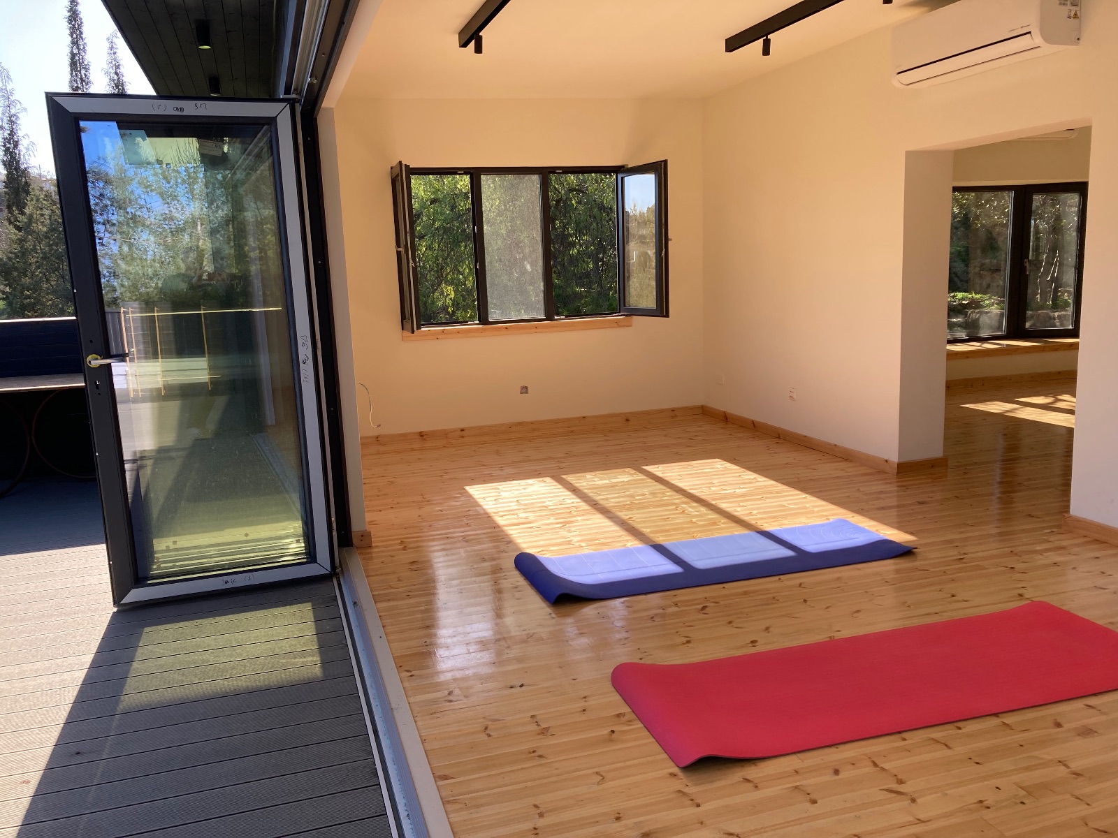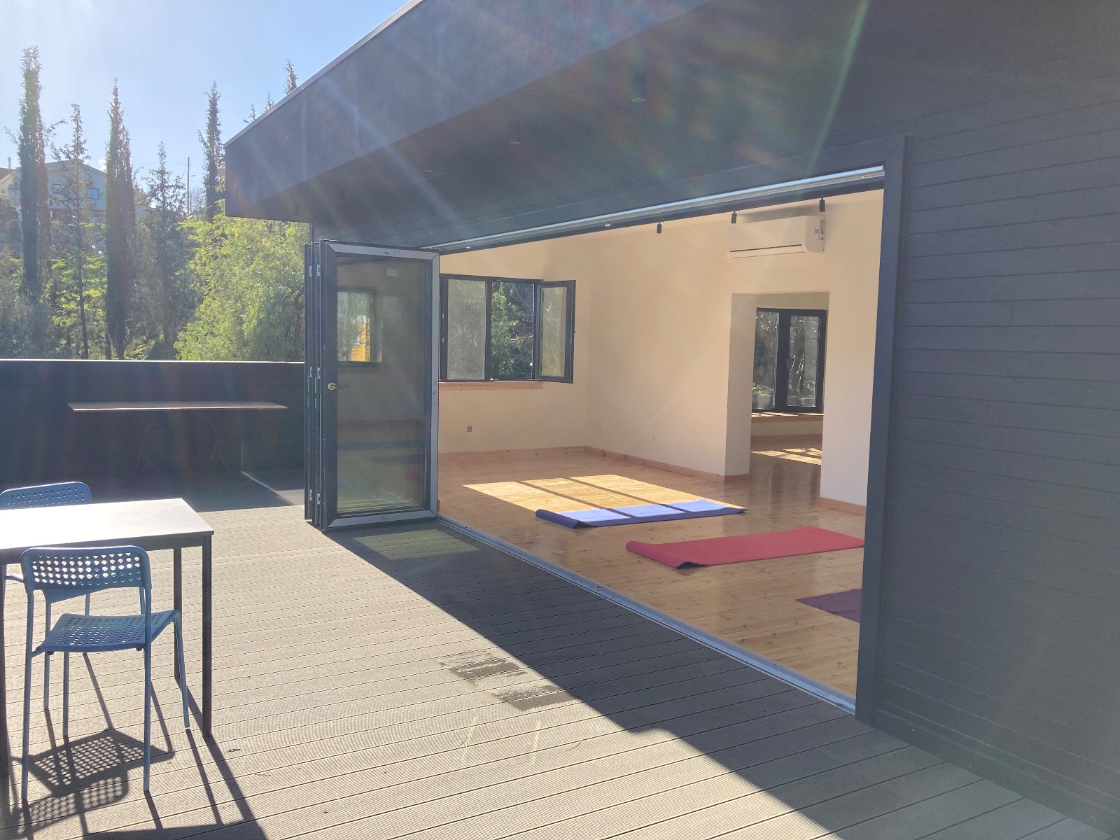 Deux vastes salles communes invitent au mouvement, à la méditation et au partage.