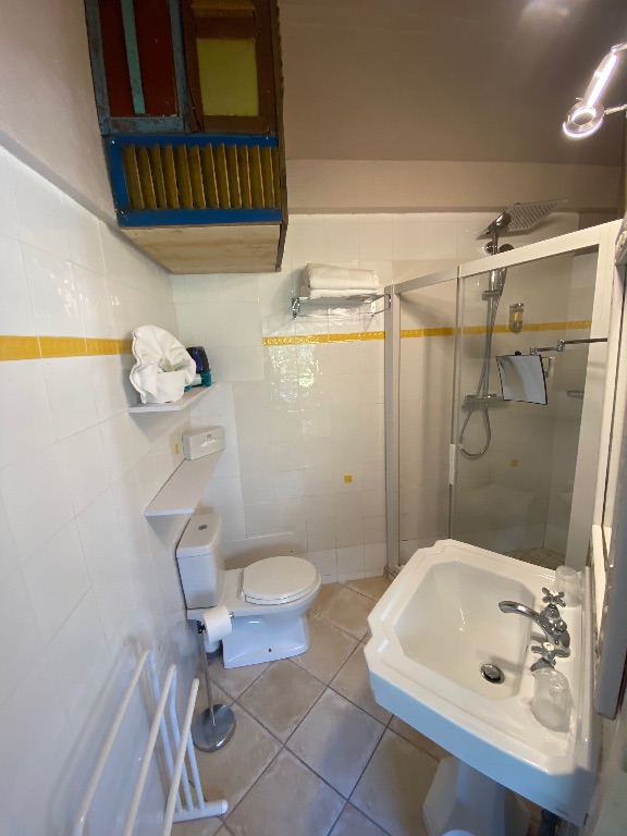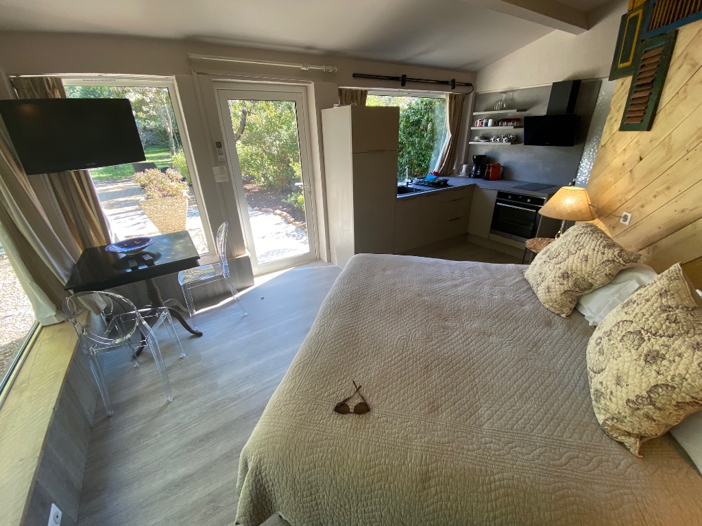 1 grand lit en 180, salle de bains avec douche, coin kitchenette avec plaques électriques, évier, frigidaire.