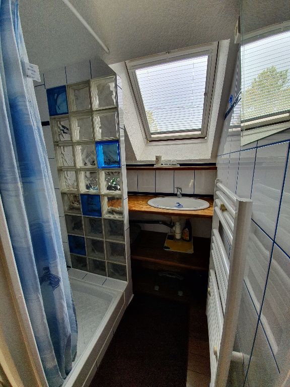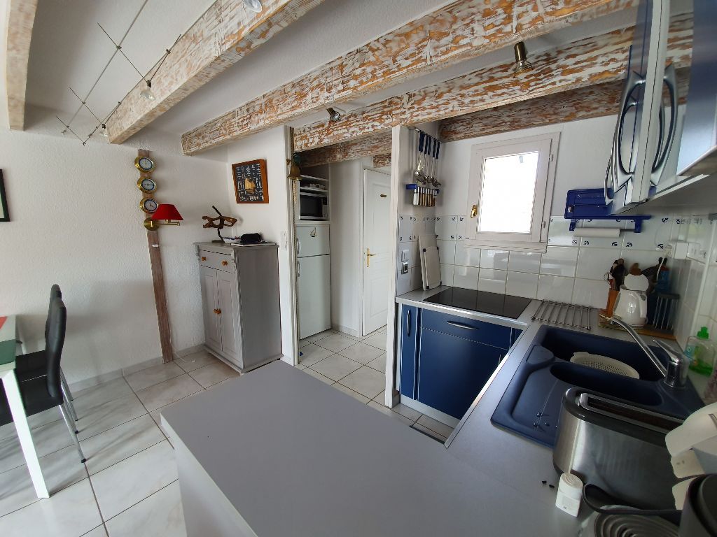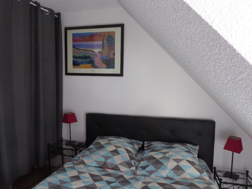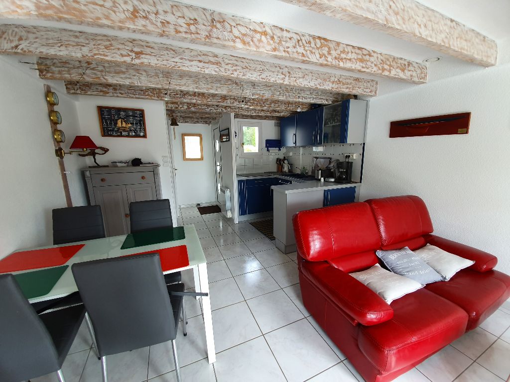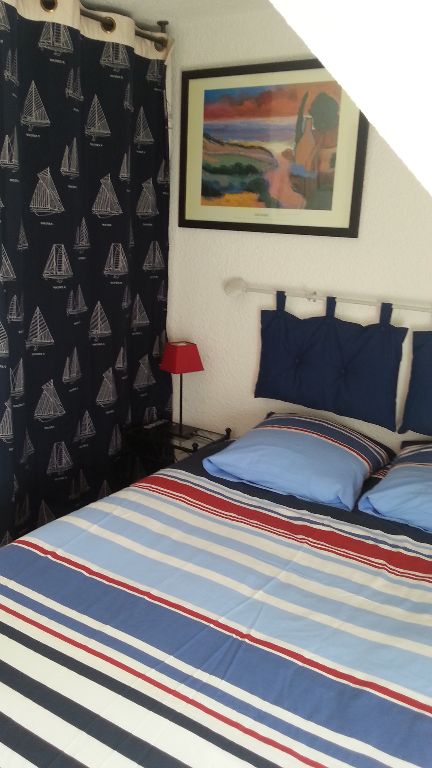 A louer appartement à 800 m. de la plage avec cuisine équipée ouverte sur séjour et à l'étage 2 chambres dont une avec un lit en 140 et l'autre avec 2 lits superposés + salle de bain avec douche et seche-cheveux. Toilettes séparés.