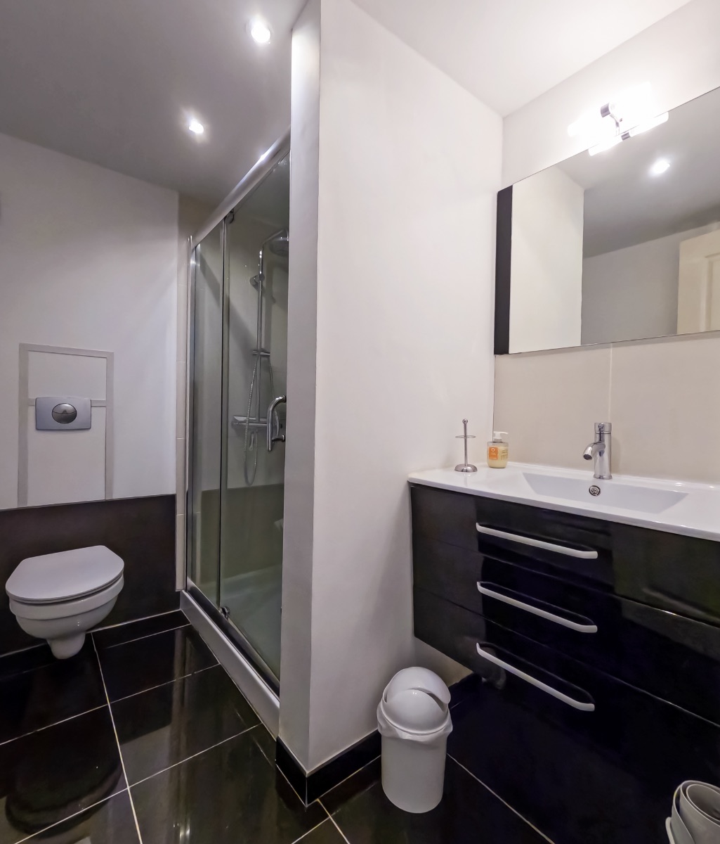 La salle de bain dispose d'une grande douche et d'un WC suspendu et nous fournissons les serviettes , débarbouillettes et un sèche-cheveux .c'est necessaire pour vous apporter votre serviettes de piscine.