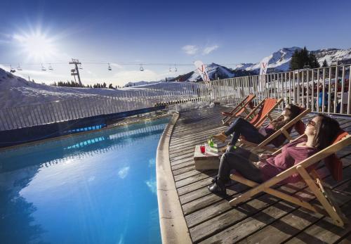 En haut du téléphérique du Pleney à 1600 m et au milieu des pistes de la station de Morzine, Vivez une expérience unique entourée de sapins enneigés.