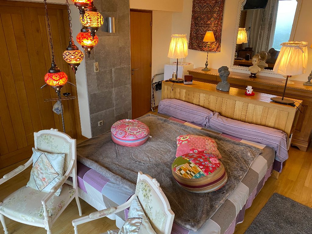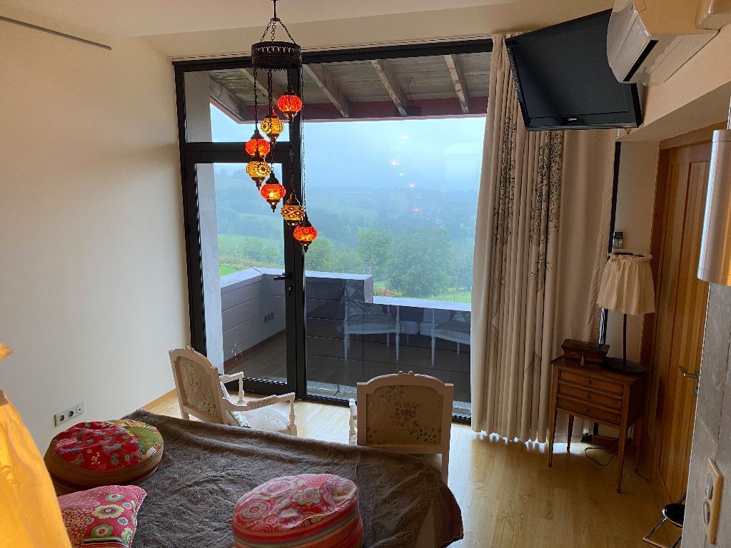 L'Atelier : chambre deux personnes tout confort, climatisation, mini bar, TV, Hifi, Wifi, douche, WC indépendants, coffre fort - terrasse privative et vue panoramique.