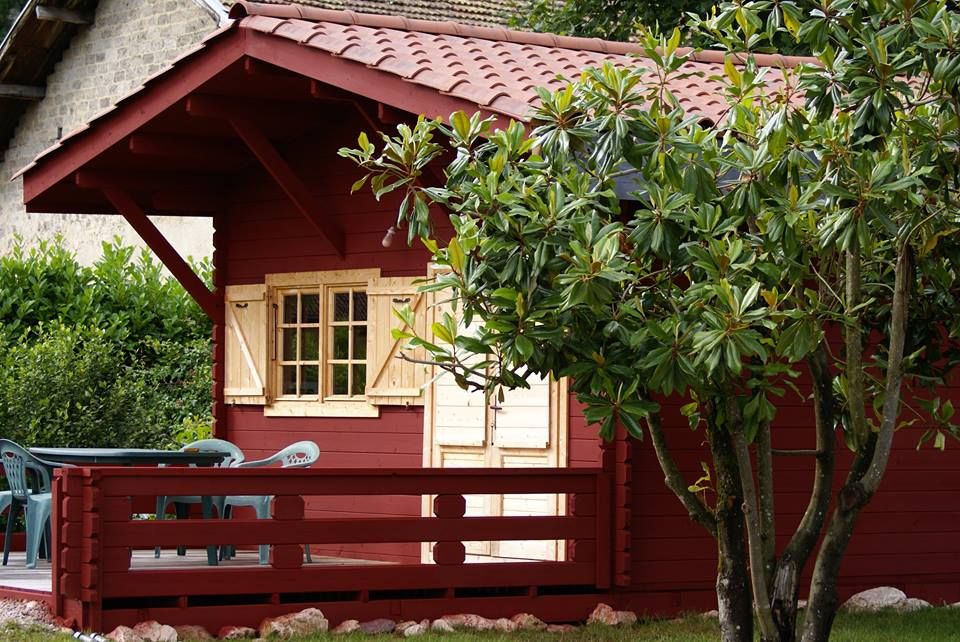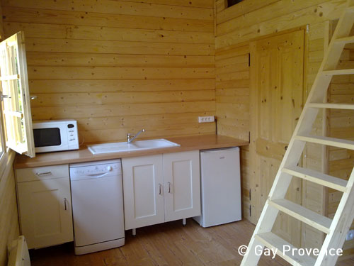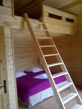 - Le Grand Chalet de 35 m² pour 2 à 6 personnes :séjour cuisine et chambre fermée avec mezzanine, s. d'eau et wc douche à jets hydromassants