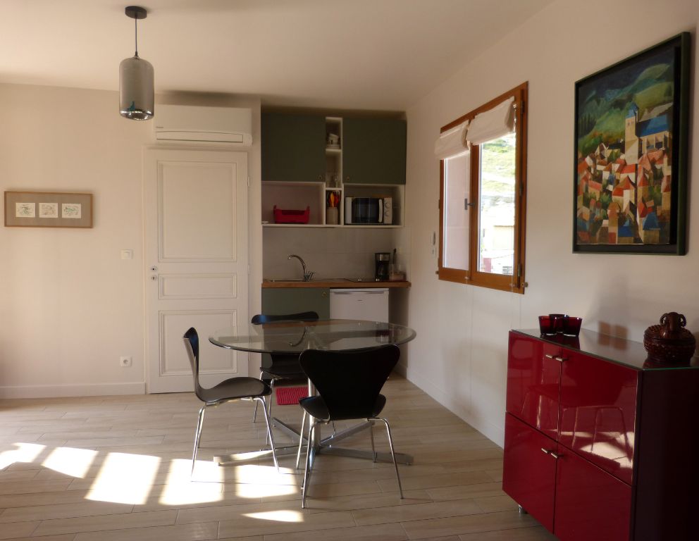 -un espace salon/salle à manger avec bloc kitchenette équipée (frigo, plaques, micro-ondes). Cet espace contient un lit supplementaire de 90