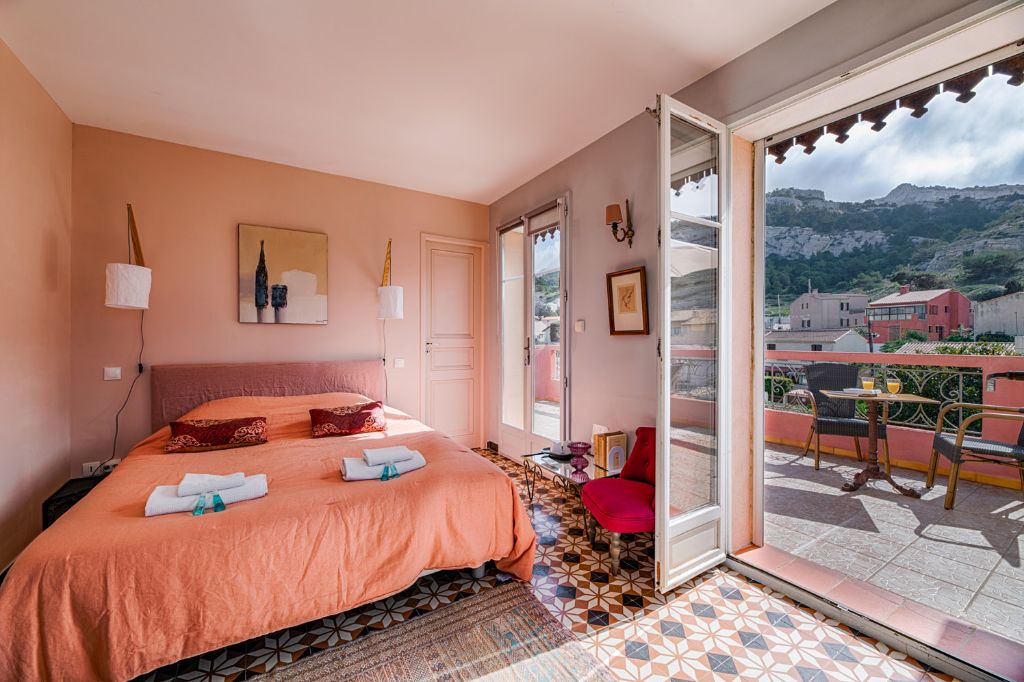 Le studio-Suite Turquoise avec kitchenette se situe au 2e étage de la maison d'hôtes avec un accés indépendant. Il dispose d'une terrasse privée qui donne sur le Parc National des Calanques, elle est équipée de mobilier pour les petits repas sous la pergola. Cet appartement a également un accés direct sur le roof top ou solarium où l'on peut profiter chaque soir d'un magnifique coucher de soleil sur les calanques.