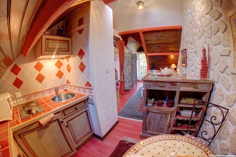Cette suite romantique située au premier étage du cottage avec balcon, a l’avantage de vous proposer toutes les prestations d’un véritable studio de charme avec sa kitchenette et coin repas, son bar, salon, grand lit double et sa très belle salle de bain en teck avec baignoire. Sa couleur rouge brique et sa décoration de meubles serrusés blancs avec une inspiration à la fois bord de mer et confins de l’Asie vous propose également calme et sérénité.