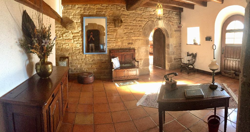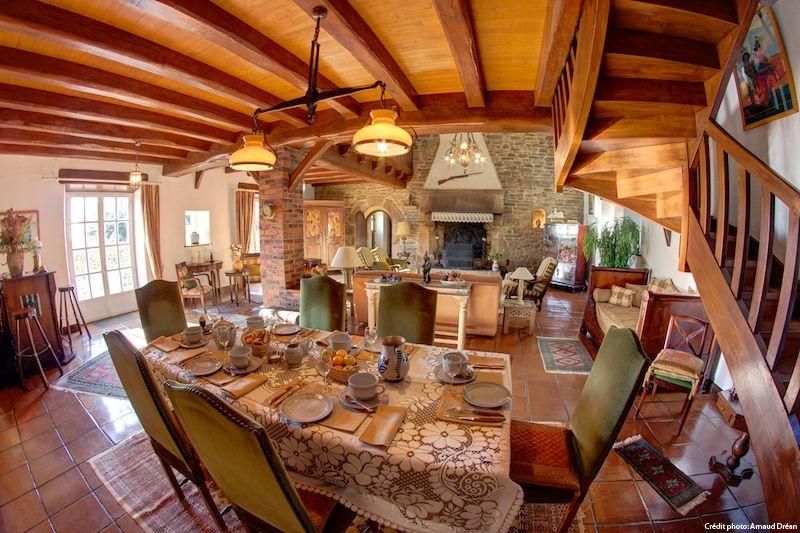 Les copieux petits déjeuners de style anglais (jus d orange, boissons chaudes, céréales,yaourts, pain et viennoiseries avec confitures maison, œufs et bacon ) sont offerts soit dans une des plus belles pièces du manoir avec pierres et poutres apparentes face a un feu de bois de notre cheminée médiévale monumentale ou en saison au pied du manoir sur la terrasse avec vue sur la piscine et l’océan pour horizon. »