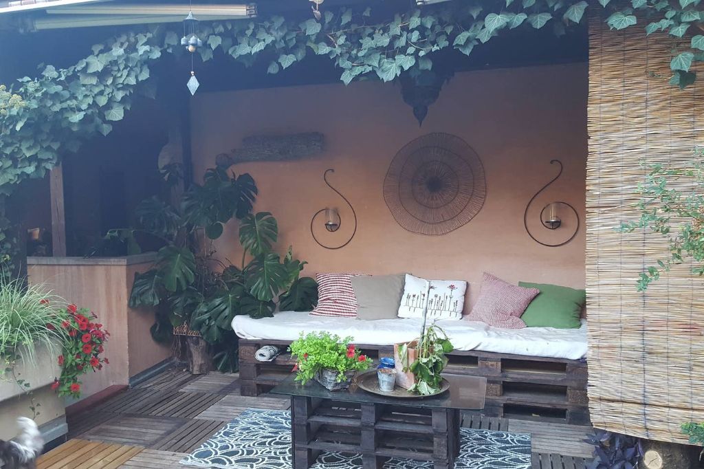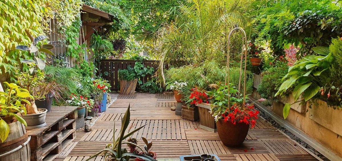 En saison, terrasse fleurie avec banquette, table, chaises