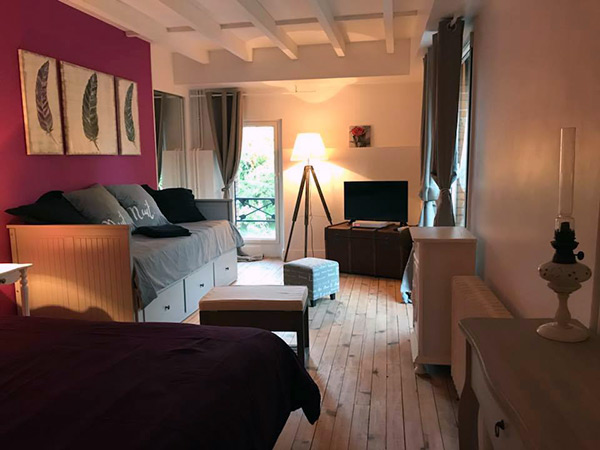 Un nid douillet aux couleurs de l'amour. Cette chambre de 34m2 profite d'une double exposition. Elle est équipée d'un dégagement, d'une salle de bain et d'un WC. Au delà de deux personnes, supplément de 30€ par personne.