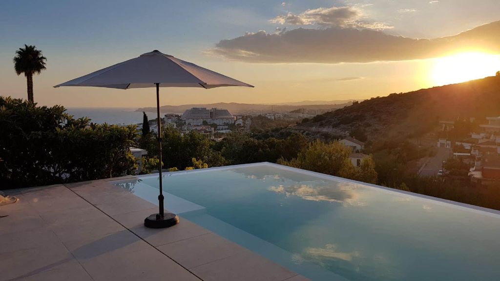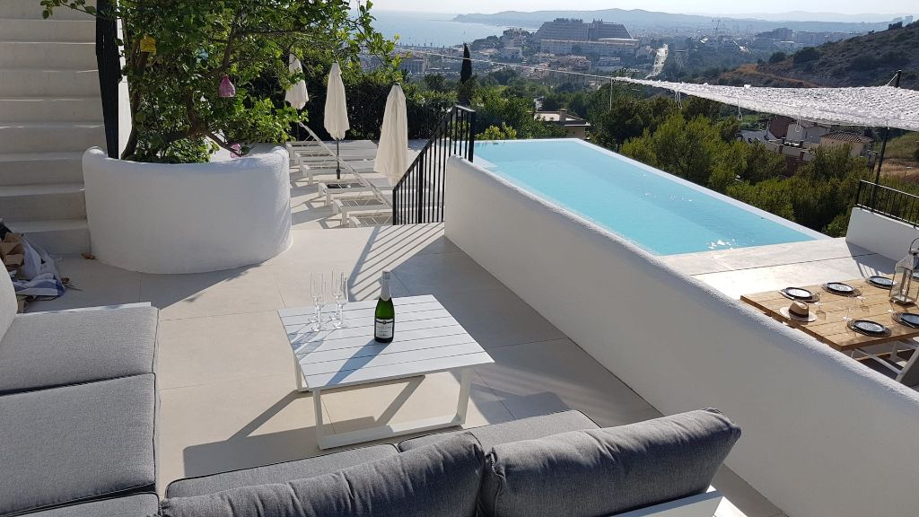 Una delle caratteristiche della casa è la splendida piscina a sfioro a doppia faccia che si affaccia sul mare e sulle colline. Questa piscina ha una panchina al coperto in modo da poter rinfrescarsi in acqua sorseggiando un cocktail e guardando gli splendidi tramonti.