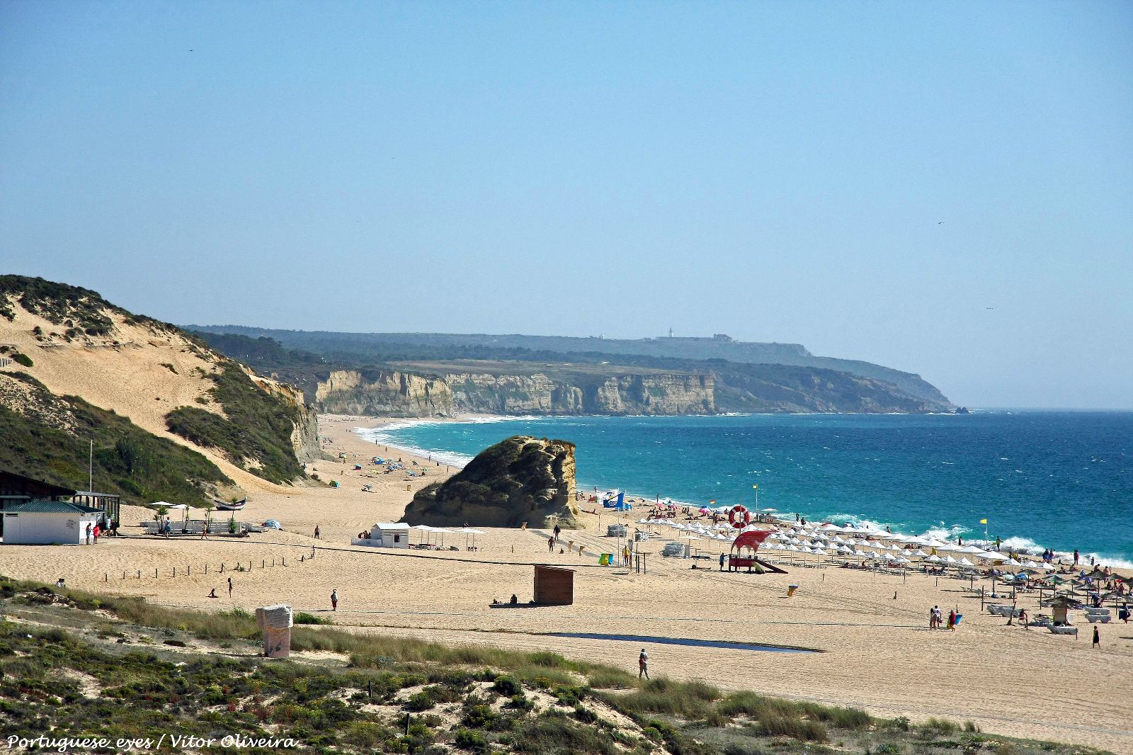 Website Young Naturists. At the beach, facing the ocean, on the left side is a high dune from where onwards start the naturist area, opposing to the right side, where the beach amenities are situated, frequented by families.