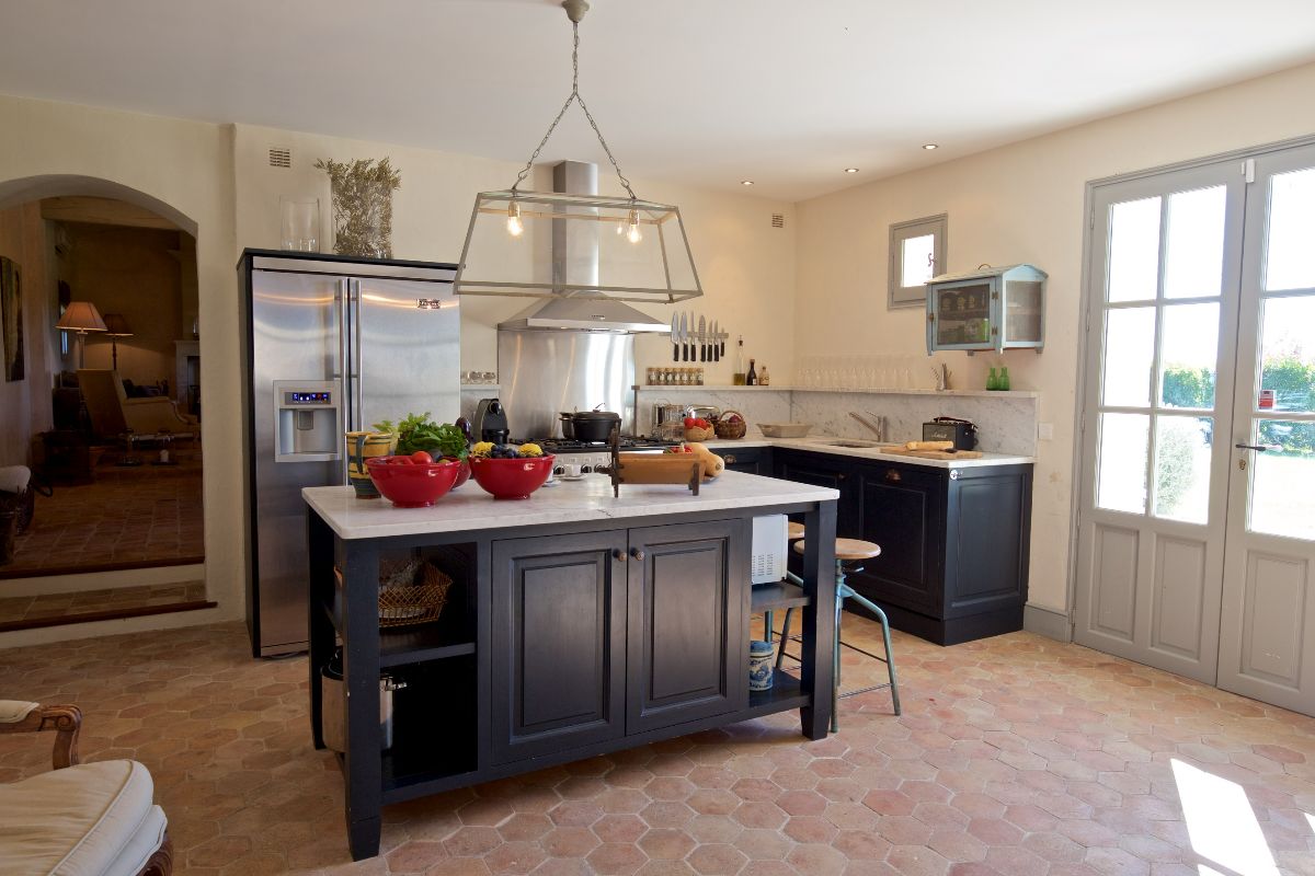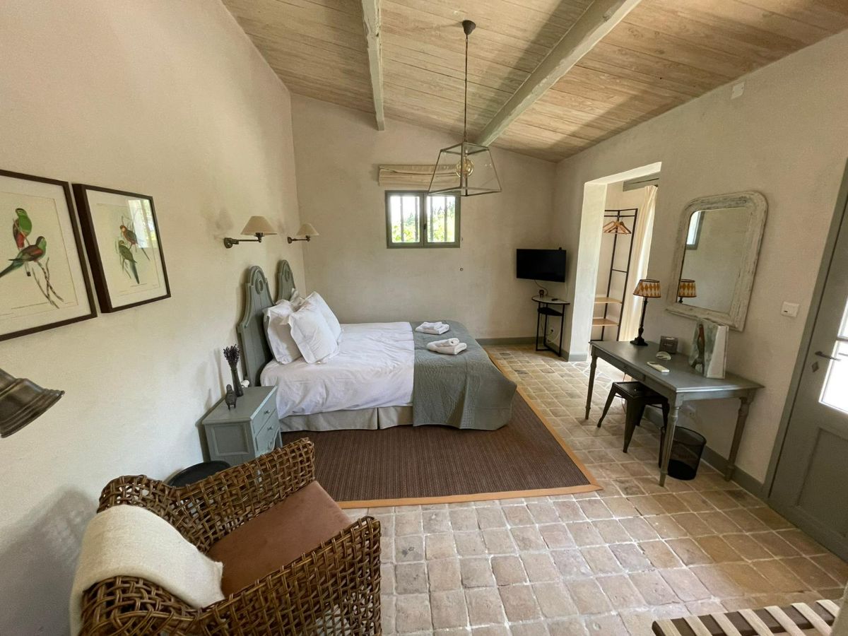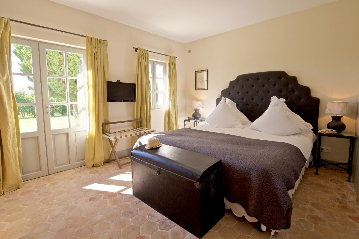 De slaapkamer op de begane grond van het hoofdgebouw bevindt zich met directe toegang tot een terras en naast de keuken.