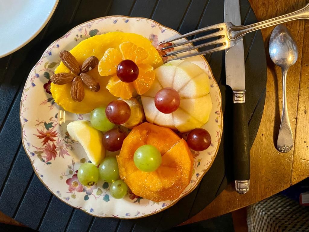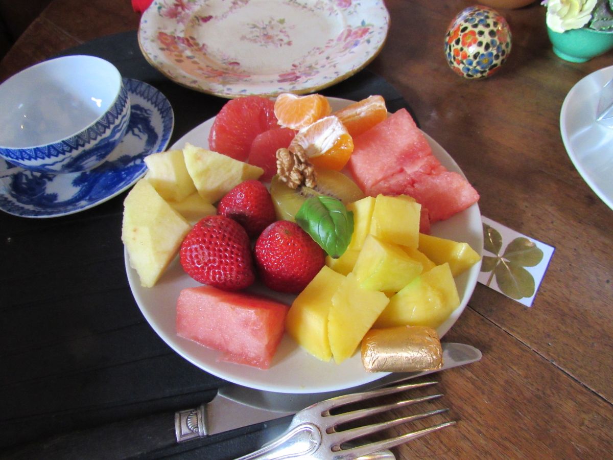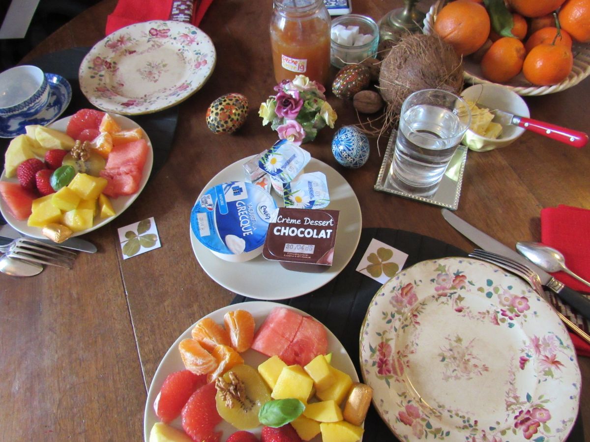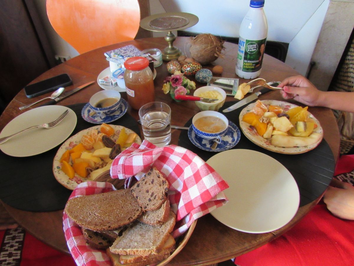 > Completer en zeer gewaardeerd, bied ik ook een extra extra ontbijt aan, (+ €6), met een stevig ontbijt, zeer Frans en multivitamine met, afhankelijk van mijn aankomsten en het seizoen: een salade van verschillende soorten fruit van de markt, Expresso koffie, fruit, brioche/toast van verschillende Poilâne-broden (mijn beroemde buurman) + gezouten boter, yoghurt en mijn zelfgemaakte jam...