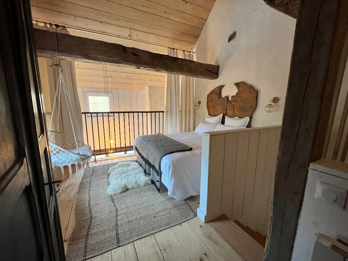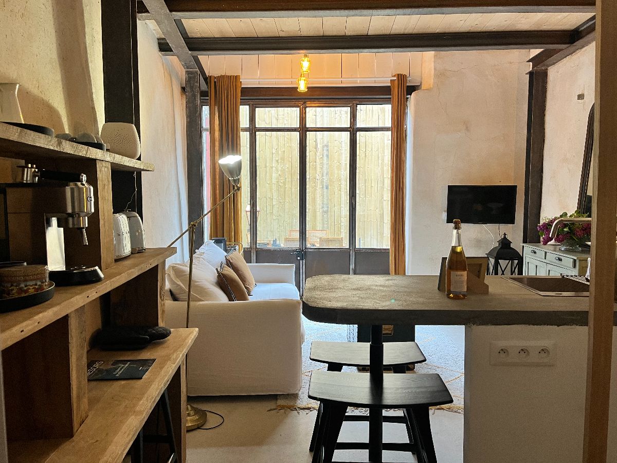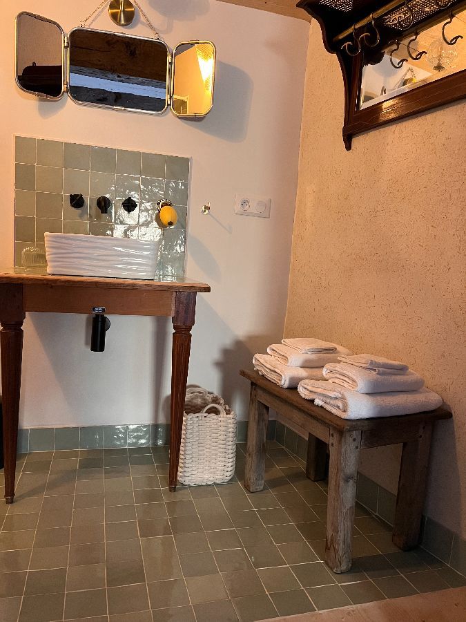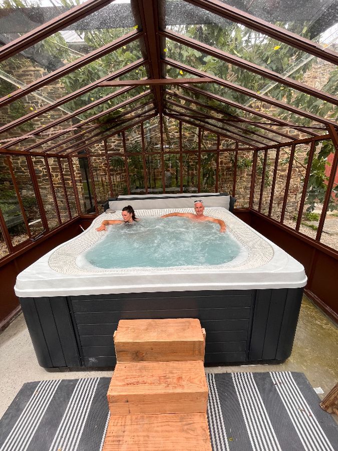 een kleine cocon van zachtheid. Boven is de slaapkamer en de badkamer, waar we gekozen hebben voor katoenen perkal beddengoed voor je nachten. Klein maar zeer goed uitgerust: wasmachine, oven, koelkast, koffiezetapparaat, waterkoker en raclette apparaat. De woonkamer heeft een slaapbank voor een derde persoon. Vanaf het geplaveide terras heb je direct toegang tot de jacuzzi en het zwembad. Je kunt ook rondwandelen in de rest van het park, waar de flora en fauna heer en meester zijn. En als je zin hebt, kun je een schotel met streekproducten voor twee bestellen, of oesters uit Cancale met een glas witte wijn.