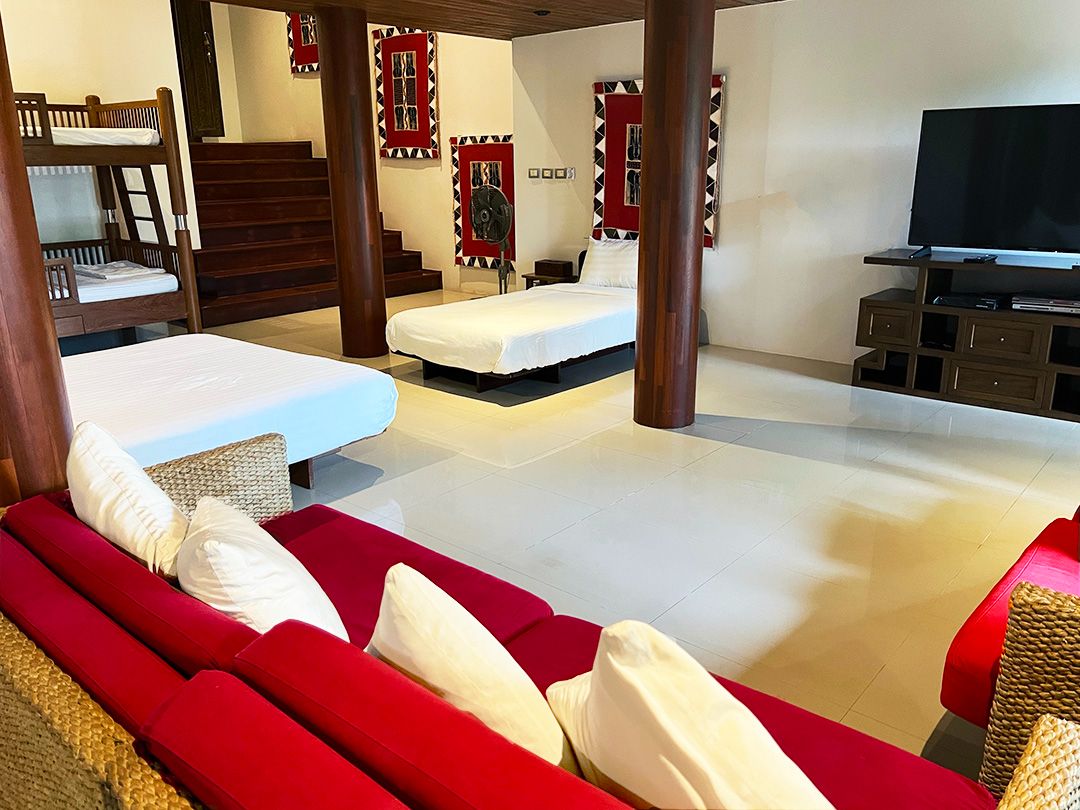 Slaapkamers kunnen worden gedeeld of gereserveerd als privékamers, indien gewenst. Ze zijn allemaal volledig voorzien van airconditioning, samen met vloer- en plafondventilatoren. De ensuite badkamers zijn uitgerust met strakke armaturen. De kamers hebben veel opbergruimte met kasten van vloer tot plafond, en veel komen uit op privéterrassen.