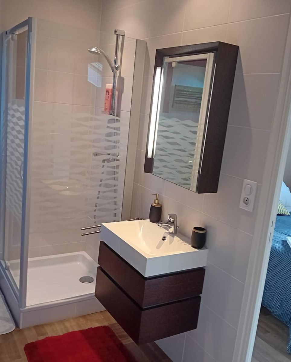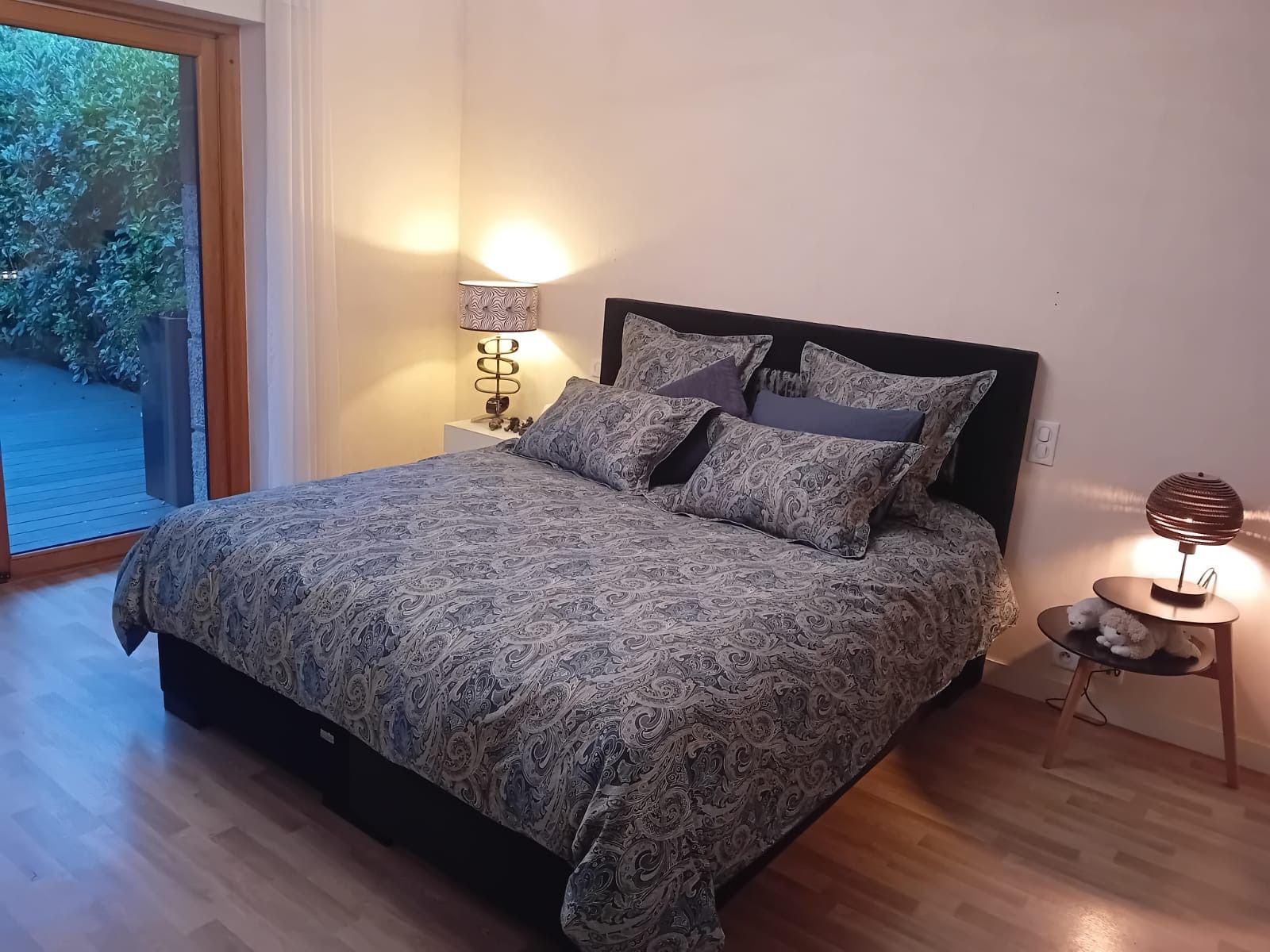 Op de eerste verdieping: bereikbaar via een elegante trap, dit niveau heeft tussenverdiepingen en twee slaapkamers die een lichte badkamer met douche delen: een slaapkamer van 16 m² met een queensize bed van 160x200 en een slaapkamer van 10 m² met een bed van 140x190.