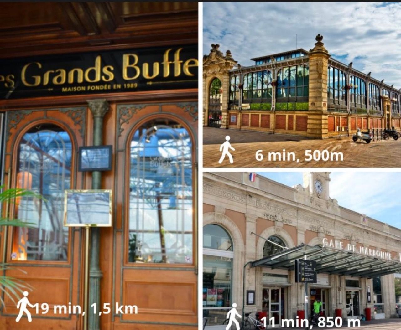 Het beroemde GRAND BUFFET ligt op slechts 5 minuten afstand, net als de HALLES DE NARBONNE, een van de mooiste markten van FRANKRIJK.