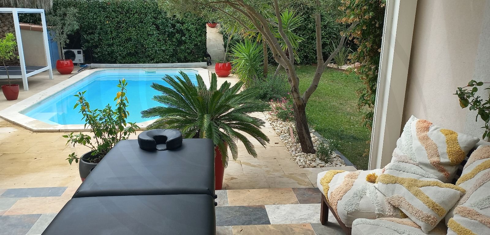 In het warme seizoen bied ik ook massages in de buitenlucht aan, in een rustgevende omgeving.