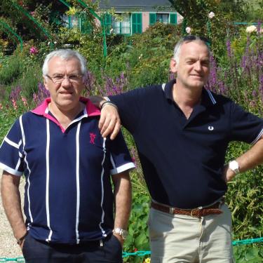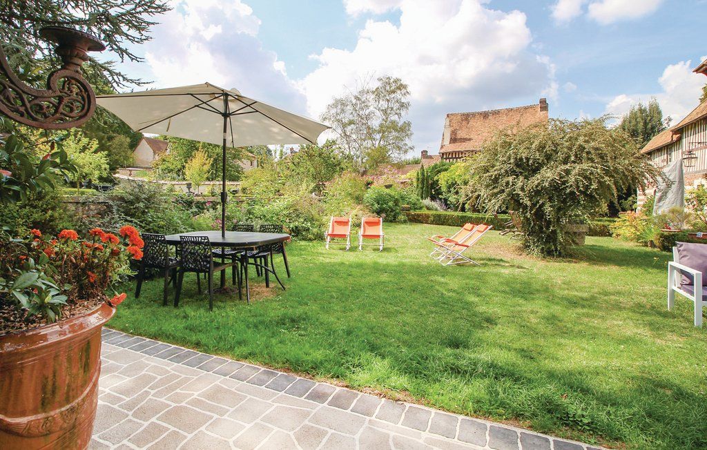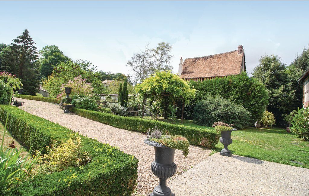Het geheel is ingesteld terug van de kleine weg langs de oevers van de Eure. mooie tuin met topiary.